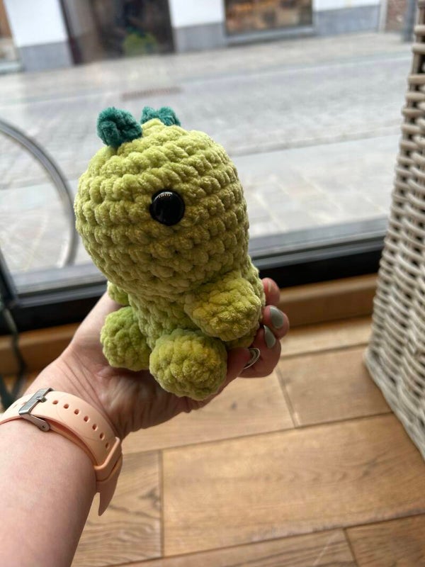 Deze kleine gehaakte dino bewijst dat je niet groot hoeft te zijn om indruk te maken. Met zijn schattige stekels, vriendelijke gezichtje en compacte formaat is hij de perfecte metgezel voor kleine handjes en grote avonturen. Ideaal als troostknuffeltje, zakvriendje of als decoratief detail op een kinderkamerplank.