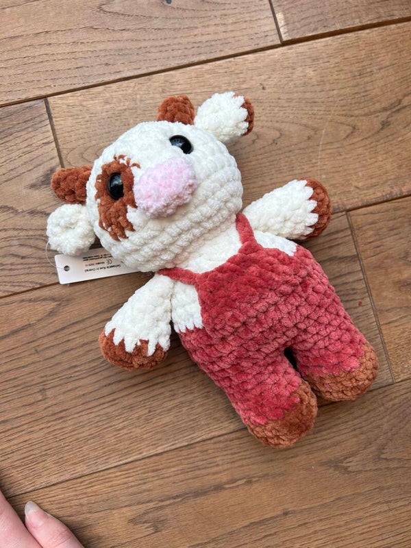Deze gehaakte koe in een zachte overall is klaar om ieders hart te veroveren. Met haar lieve kraaloogjes, pluizige snoet en bordeauxrode tuinbroek is ze een charmante knuffelvriend vol persoonlijkheid. Of ze nu op de boerderij speelt of gewoon lekker op bed ligt te chillen: deze koe voelt zich overal thuis.