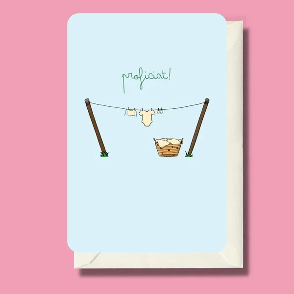 Deze schattige kaart met babykleertjes is perfect om de komst van een nieuw wondertje te vieren.