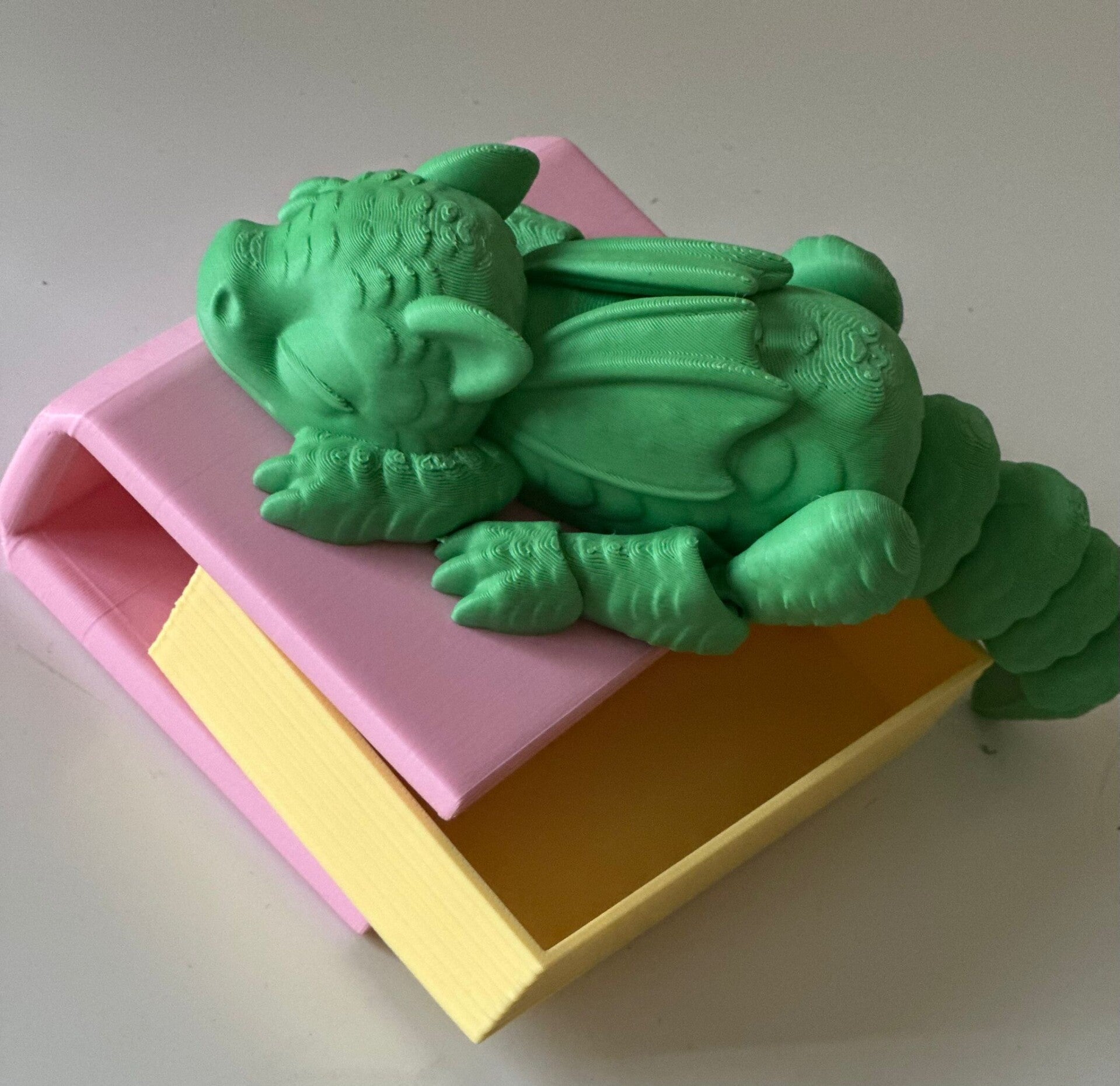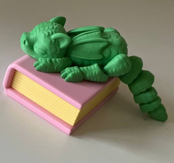 Deze schattige draak, Lumo, rust vredig op een boek en lijkt zo weggelopen uit een magisch verhaal. Elk exemplaar wordt 3D-geprint met oog voor detail en is uniek in kleur en afwerking.