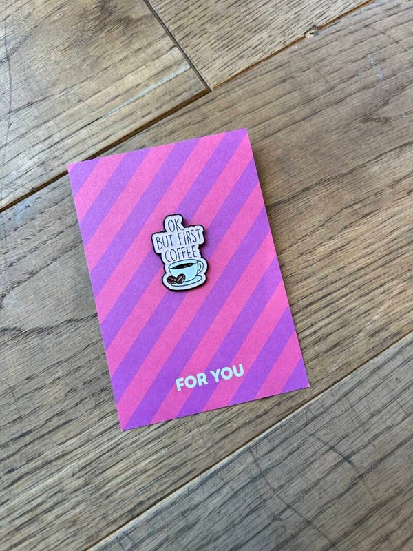 Emaille pin in de vorm van een koffietas met de tekst ‘OK, BUT FIRST COFFEE’