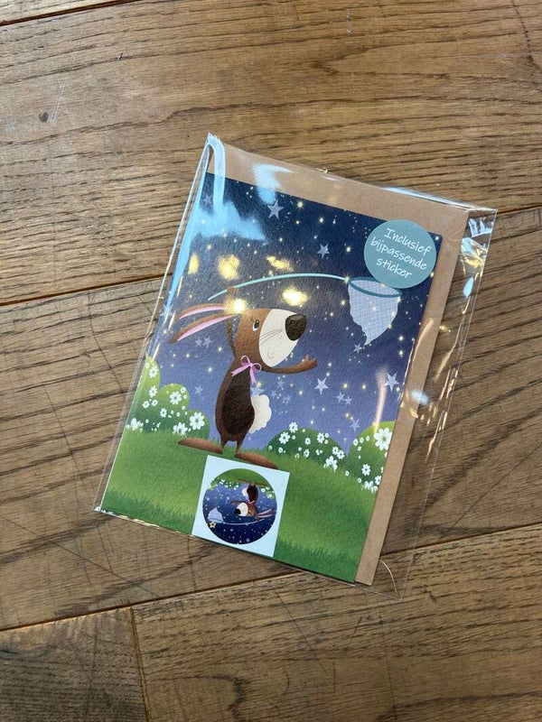 Deze lieve kaart toont een dromerig konijntje dat onder een sterrenhemel sterren probeert te vangen met een netje. Ideaal om iemand een wens te sturen, een beetje hoop te brengen of gewoon een glimlach te bezorgen.