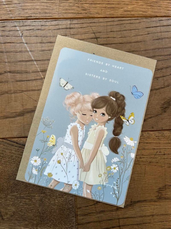 Een hartverwarmende kaart vol zachte bloemen, vlinders en verbondenheid. De illustratie van twee meisjes hand in hand, gecombineerd met de tekst “Friends by heart and sisters by soul”, maakt dit een bijzonder geschenk voor je beste vriendin, soul sister of zus met wie je een diepe band voelt.