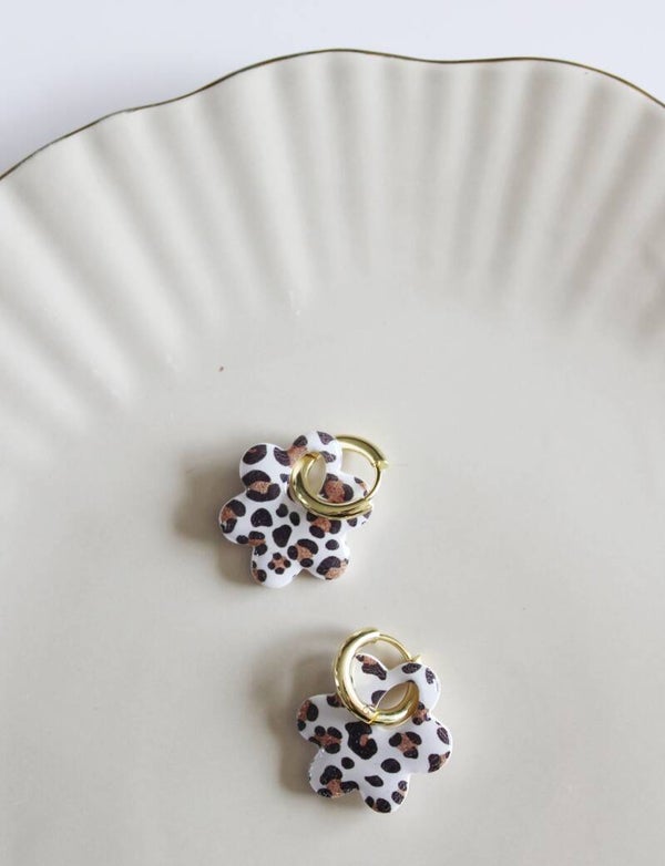 Durf op te vallen met deze speelse en stijlvolle oorbellen! Deze handgemaakte bloemvormige hoops zijn gemaakt van lichtgewicht polymeerklei en voorzien van een trendy luipaardprint. Een combinatie van fun en flair, perfect voor wie houdt van een edgy touch bij elke outfit.