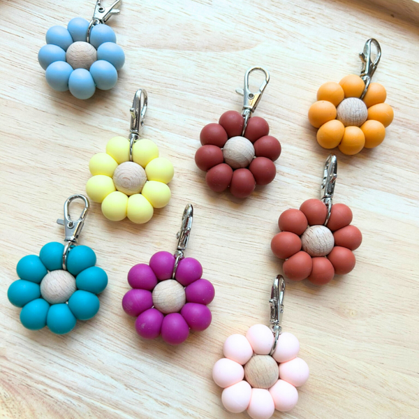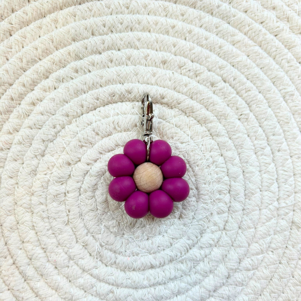 Deze paarse siliconen bloem-sleutelhanger brengt kleur, zachtheid en een vleugje fantasie samen. Met haar bloemblaadjes uit siliconen en een houten kraal in het hartje, is ze perfect als vrolijke toevoeging aan een sleutelbos, boekentas of cadeautje.
