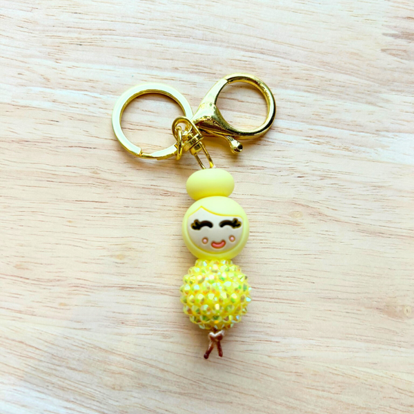Deze vrolijke sleutelhanger met schattig siliconen meisje en glinsterende gele discobal-kraal is gemaakt om te laten stralen.