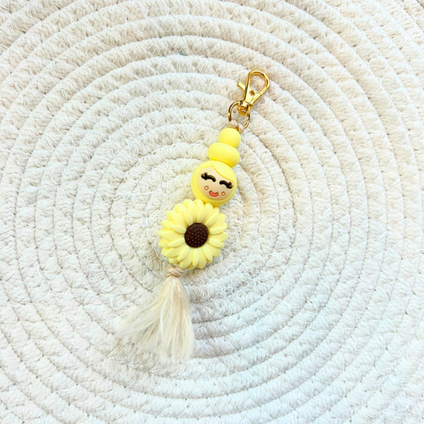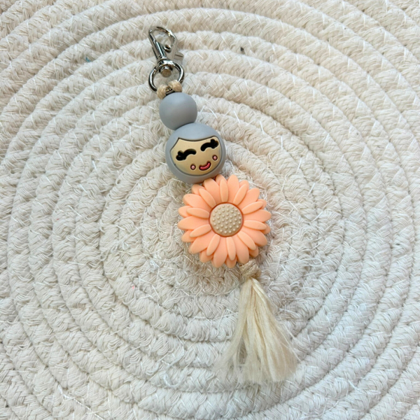 Deze schattige sleutelhanger met blozende meisjeskraal, zachte bloem en kwastje is een echte blikvanger voor jong en oud. De zachte kleuren en speelse vorm maken dit een ideaal accessoire voor aan een boekentas, sleutelbos, handtas of cadeauverpakking.