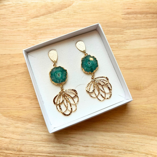 De oorbellen zijn afgewerkt met verguld messing, wat zorgt voor een warme gouden gloed zonder zwaar aan te voelen. Ze combineren elegantie met een vleugje bohemian luxe ideaal voor dagelijks gebruik of een bijzondere gelegenheid.