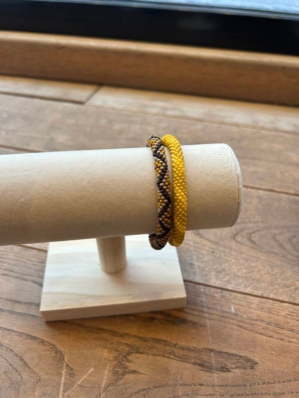 Laat je pols spreken met deze kleurrijke Wiza armbanden een uniek duo van handgehaakte kralenarmbanden in warme tinten geel, bruin en goud. Elke armband wordt met zorg en geduld opgebouwd, kraletje voor kraletje, wat zorgt voor een stevige structuur en een luxe uitstraling.