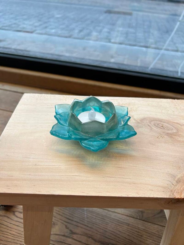 Deze prachtige lotus theelichthouder in turquoise epoxy straalt frisheid, helderheid en balans uit. De goudkleurige flakes zorgen voor een magisch effect zodra het licht door het epoxyspel schijnt. Ideaal voor een rustmomentje of als betekenisvol geschenk.