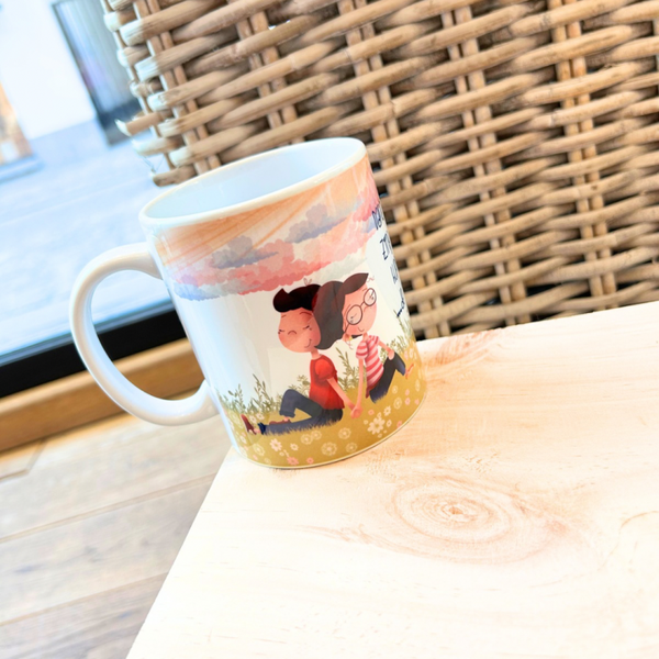 Mok met een speelse en vrolijke illustratie van een koppeltje dat rug tegen rug zit, klaar om samen te dansen, lachen, fluiten, zingen, schommelen, huppelen en springen… de wereld in.