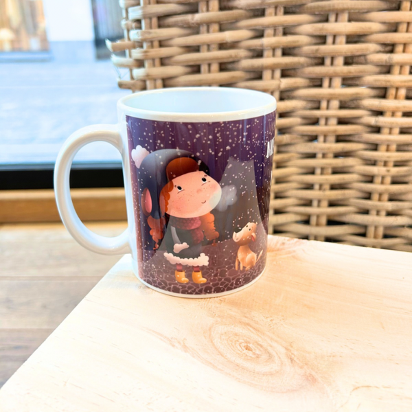 Mok met een sfeervolle illustratie van een meisje en haar hond in een winterse setting.