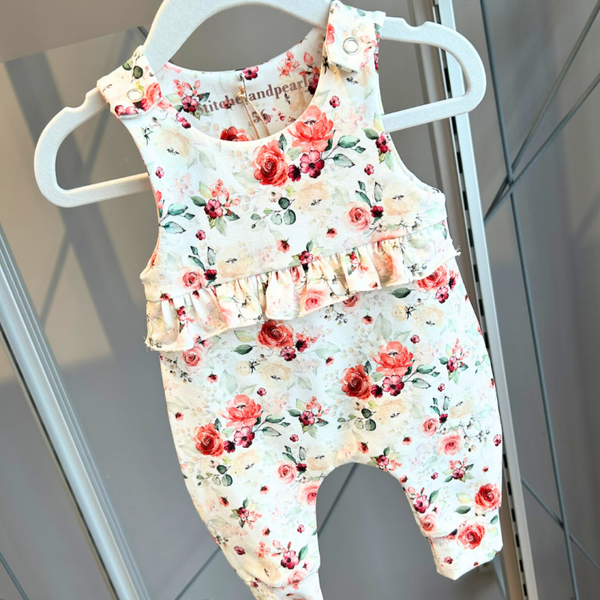 Lieve strampler met rozenprint en schattige ruffle aan de voorkant.
