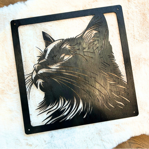 Het hout geeft een rustieke, gezellige toets en de gedetailleerde lijnen brengen de poes tot leven.
