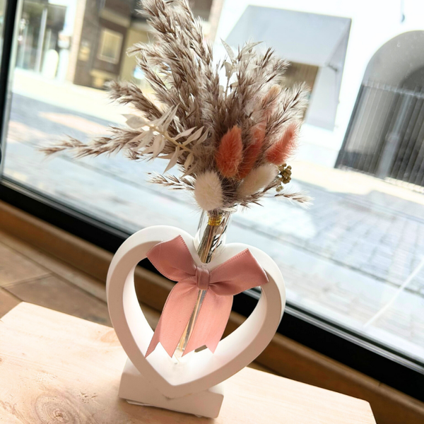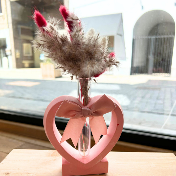 Vaasje in hartjesvorm met droogbloemen, handgemaakt uit jesmonite.