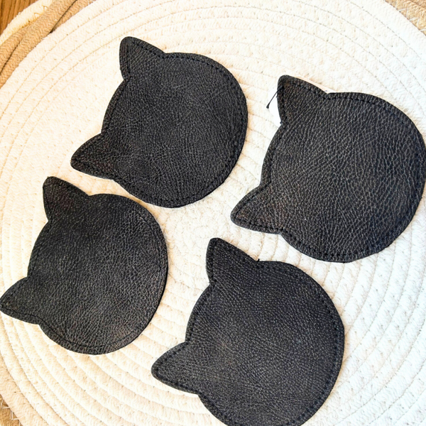 Set van 4 lederen onderleggers in de vorm van een poes een speelse en stijlvolle toevoeging aan je tafel.Gemaakt van stevig en duurzaam leder dat je tafel beschermt tegen kringen en vlekken.Leuk detail voor kattenliefhebbers en perfect als cadeau.