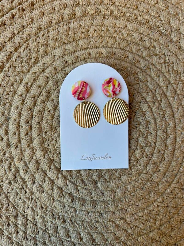 De bovenste knop is handgemaakt uit polymeer klei in een mix van roze, geel en wit elke knop is uniek. Daaronder hangt een ronde, goudkleurige hanger met een fijne ribbelstructuur die het licht prachtig vangt. Samen vormen ze een oorbel die kleur en klasse uitstraalt.