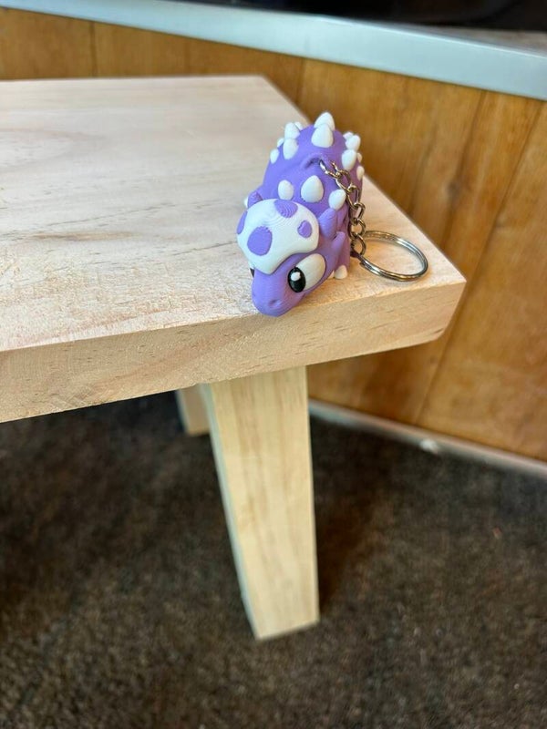 Deze schattige dino ligt plat op zijn buik, met een nieuwsgierige blik en een lijfje vol witte stippen en stekels. De zachte paarse tint geeft hem een speelse uitstraling, perfect voor kinderen én volwassenen die houden van unieke accessoires.