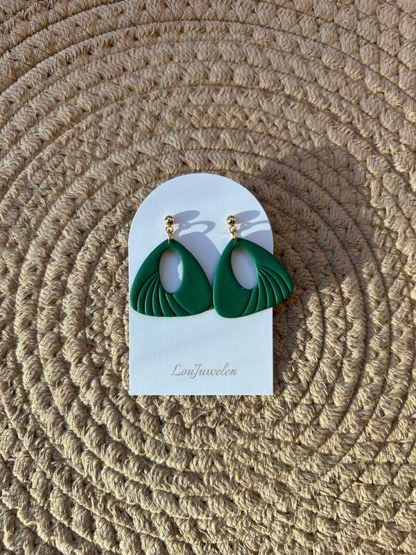 De oorbellen hebben een uitgesneden driehoekige vorm met afgeronde hoeken en een golvend reliëf aan de zijkant. De matte groene kleur straalt rust en kracht uit, terwijl de gouden steker een vleugje luxe toevoegt.