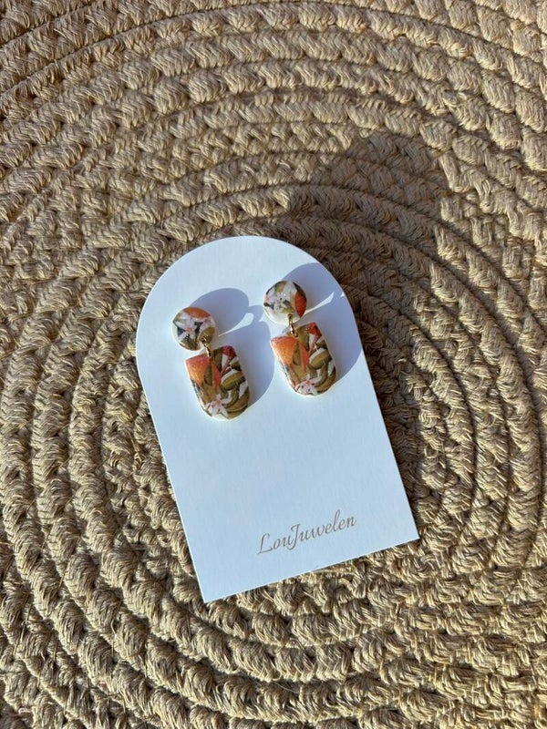 De oorbellen bestaan uit twee afgeronde elementen: een kleine bovenste knop en een grotere hanger. Het patroon toont een mix van sinaasappelschijfjes, groene bladeren en witte bloesems op een zachte witte achtergrond. Elk paar is uniek en straalt rust, frisheid en creativiteit uit.