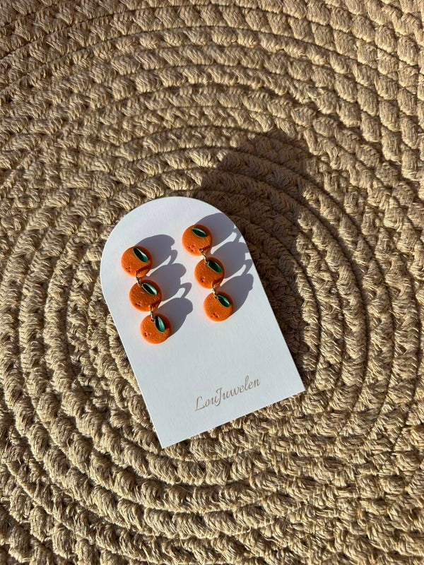 De oorbellen zijn opgebouwd uit drie mini-appelsienen die verticaal onder elkaar hangen. De levendige oranje kleur en het groene blaadje zorgen voor een frisse, zomerse uitstraling. Lichtgewicht en handgemaakt, deze oorbellen zijn niet alleen leuk om te dragen, maar ook om naar te kijken.