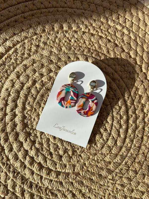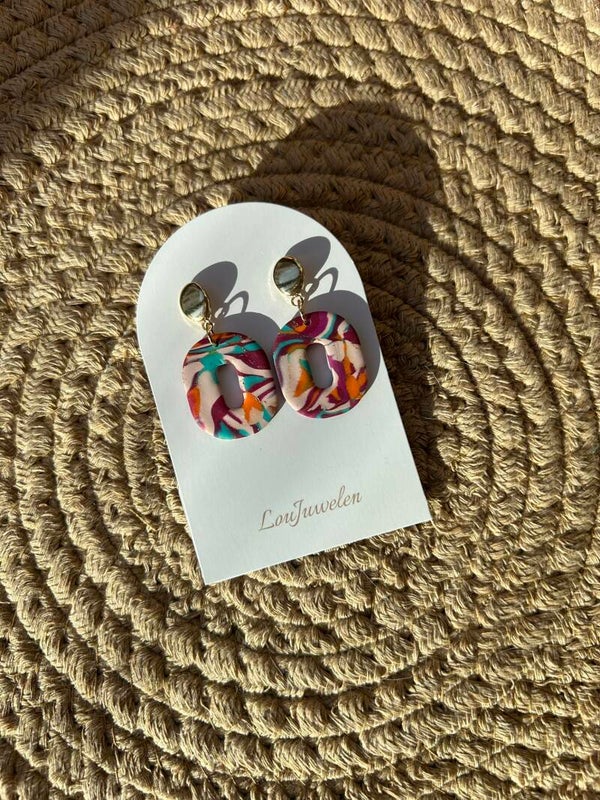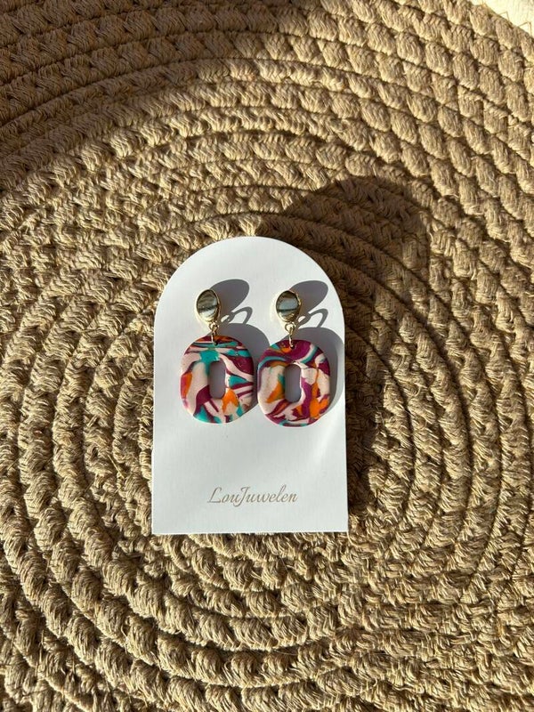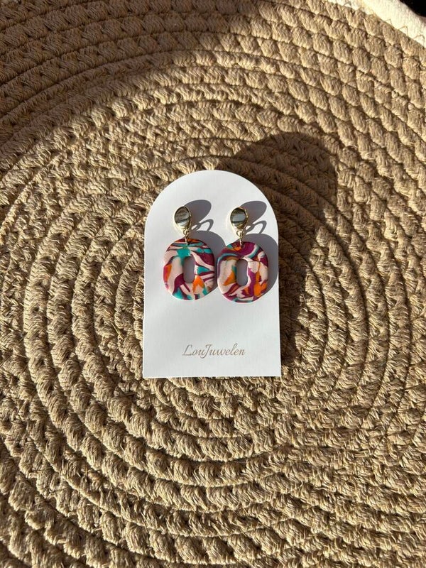 De oorbellen zijn gemaakt van lichtgewicht materiaal met een levendig patroon in tinten zoals roze, oranje, paars, wit en groen. De open ovale vorm geeft luchtigheid en beweging, terwijl de gouden steker zorgt voor een elegante afwerking. Elk paar is net iets anders, waardoor je altijd een uniek exemplaar draagt.