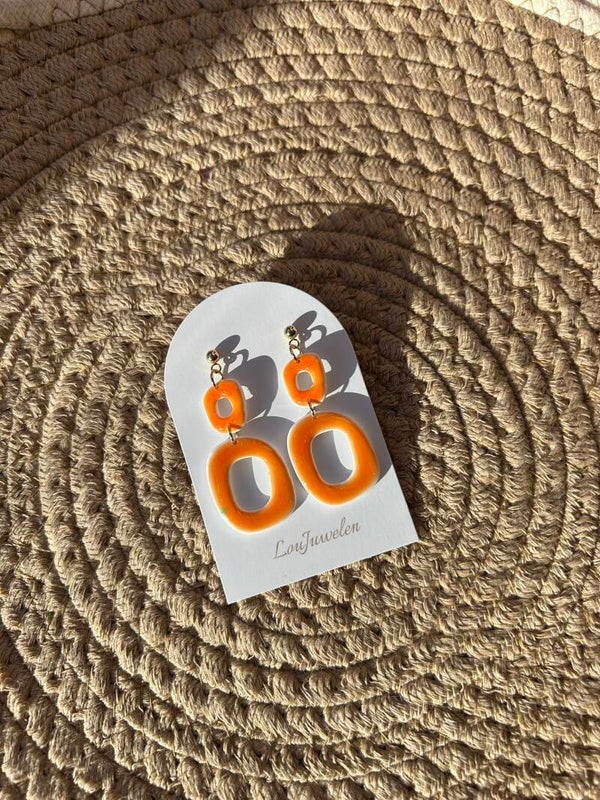 De frisse oranje tint straalt energie, creativiteit en positiviteit uit. De oorbellen bestaan uit twee elementen: een kleine ronde bovenkant en een grotere open ovale hanger. De combinatie van geometrie en kleur zorgt voor een modern en kunstzinnig silhouet dat meteen in het oog springt.